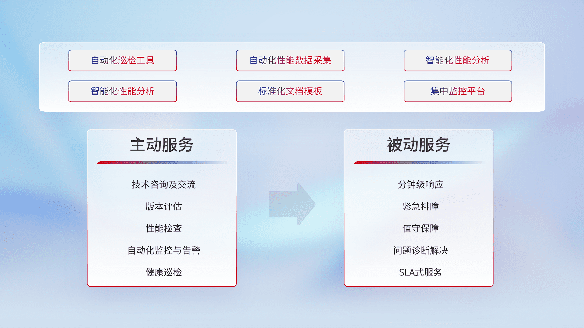 智能化工具和标准化文档,,,保障服务质量,,提供主动服务(包含技术咨询、、版本评估、、、、性能检查、、自动化监控与告警、、健康巡检)和被动服务包含(分钟级响应、、紧急排障、、、、值守保障、、、问题诊断解决、、、SLA服务)。。。