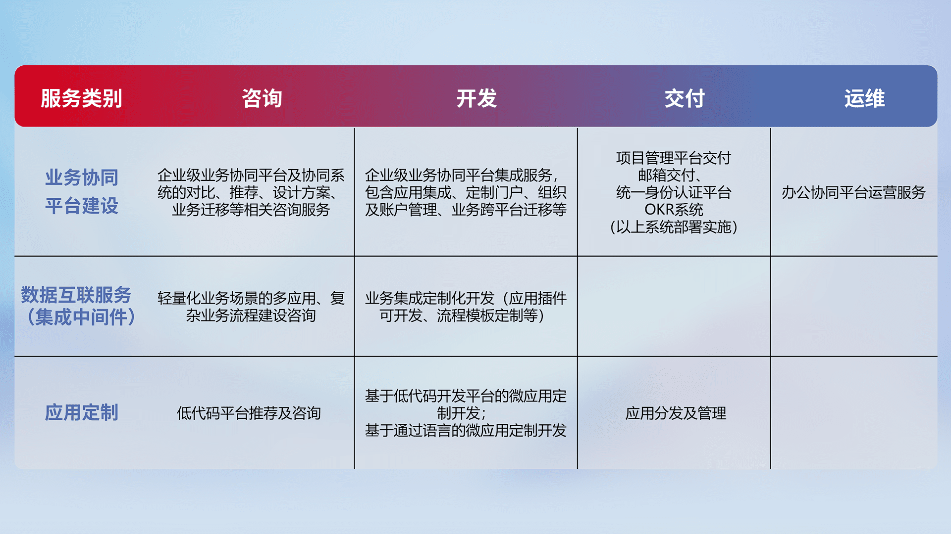 针对钉钉、、、、企微、、、IDaas等平台级产品提供产品的规划、、、、方案、、、交付、、定制化开发等服务,,,实现如统一协同办公、、智能客户服务、、混合会议管理、、智能数据查询、、、、等业务场景,,,,实现数字化转型。。